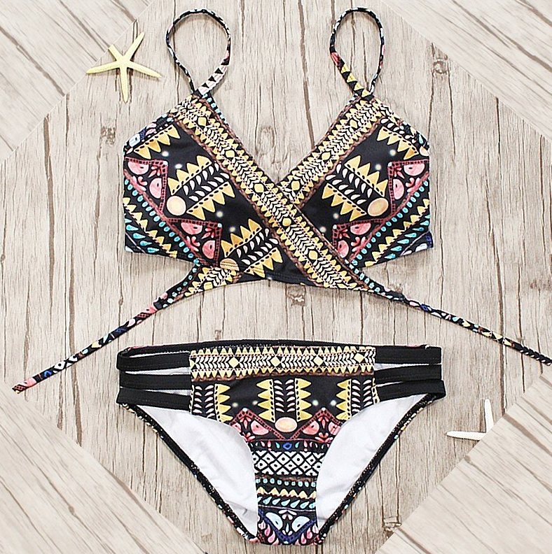 Discover your bold, confident side with this striking bikini, designed to flatter your figure while showcasing vibrant ethnic-inspired prints. Featuring a chest-cross strap and push-up support, it’s the perfect choice for making a statement by the water.