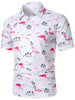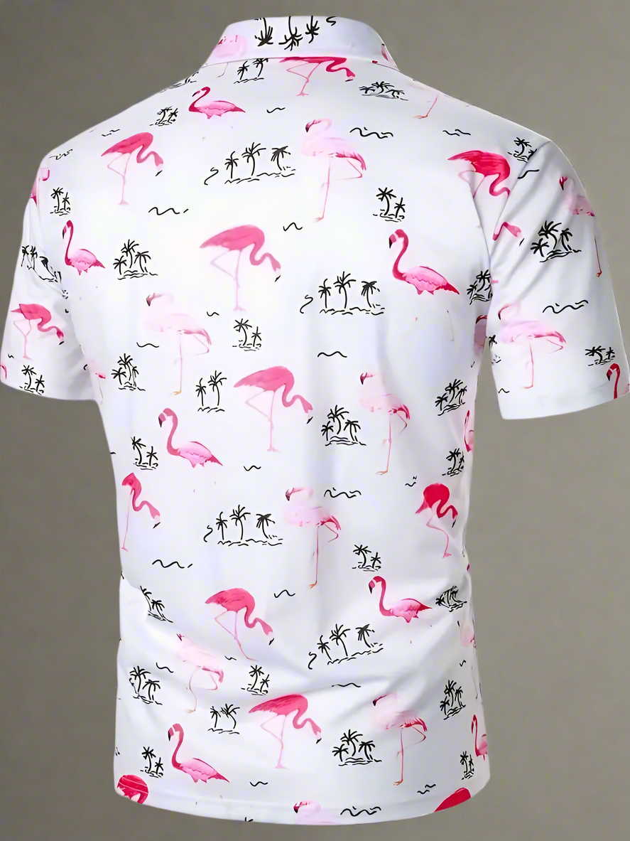 This short-sleeve button-up shirt combines a bold flamingo print with a relaxed, breathable fit. Whether you’re enjoying a beachside escape or a casual outing, this shirt offers a fresh, lively style that’s perfect for warm-weather adventures.