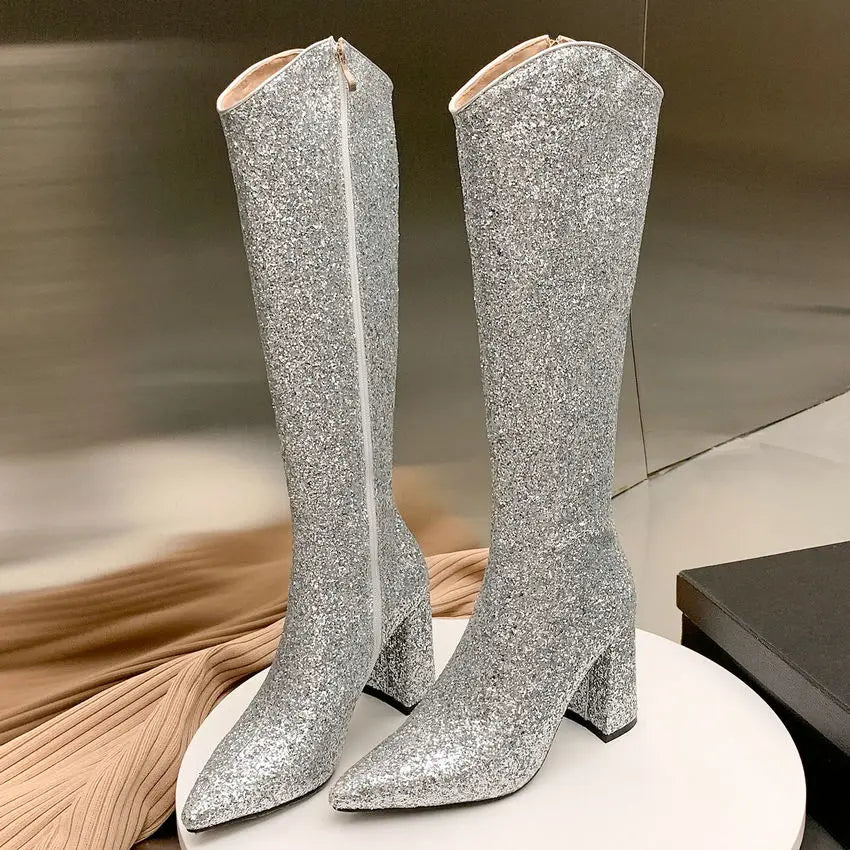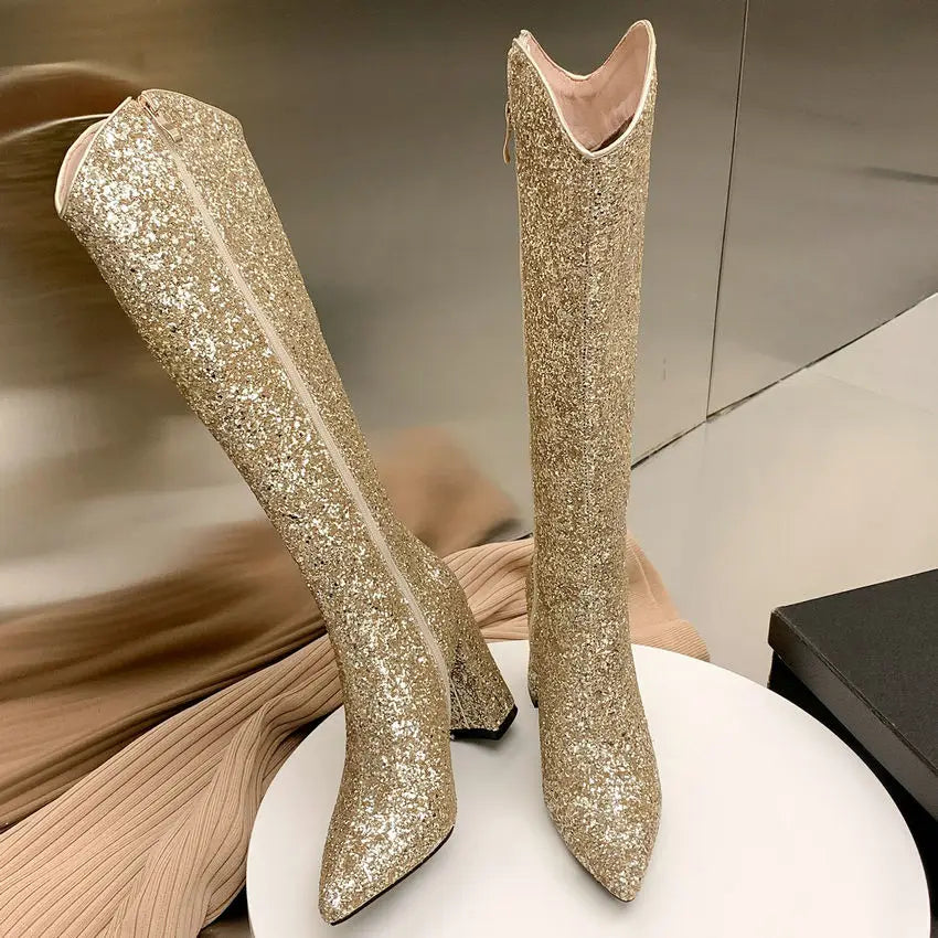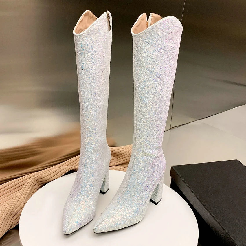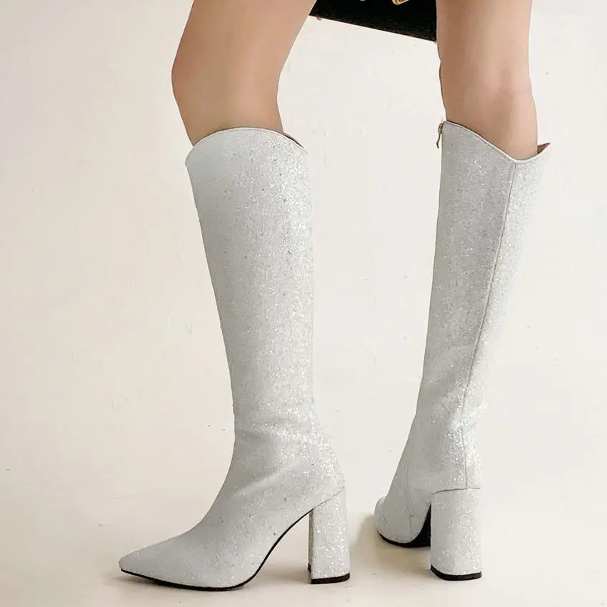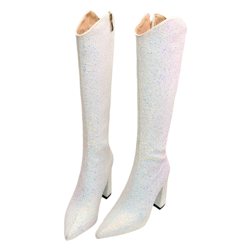 Turn heads with the Ariana boots, where charm meets glamorous sparkle. These knee-high stunners are designed to make every stride unforgettable, blending timeless boot style with a modern, glittery twist. Whether you're hitting the town or shining at an event, Ariana boots are your perfect statement piece.