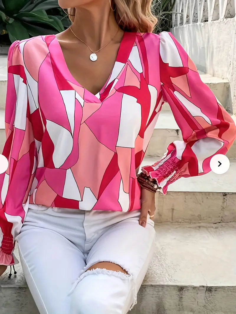 Step into the season with confidence wearing the Aurélie Geometric Summer Blouse. Featuring a chic V-neckline, bold colorblock design, and striking geometric print, this blouse perfectly balances comfort and style. Crafted from lightweight, breathable materials, it’s your go-to piece for hot summer days.