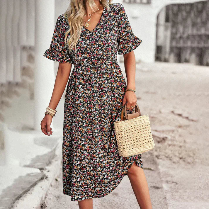 Genießen Sie die Schönheit des Frühlings mit Emerys floralem Midikleid, einer perfekten Mischung aus Eleganz und Charme. Das lebendige Blumenmuster erblüht über die mittellange Silhouette und fängt die Essenz der Saison ein. Mit seinem schmeichelhaften Schnitt und der bequemen Passform passt dieses Kleid mühelos von Freizeitausflügen zu eleganteren Anlässen. Das florale Midikleid von Emery ist eine vielseitige und stilvolle Wahl für Ihre Frühlingsgarderobe, mit der Sie Ihre Liebe zur Natur und Mode zum Ausdruck bringen können. Werten Sie Ihren Frühlingslook mit diesem zeitlosen Stück auf, das die Frische und den blühenden Geist der Saison verkörpert.