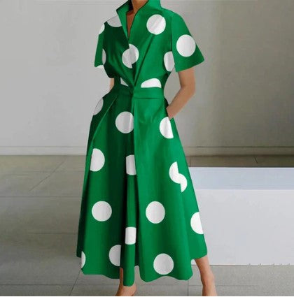 Step into grace with Elena, a green maxi dress adorned with delicate polka dots and short sleeves. Designed for versatility and comfort, it’s your go-to piece for casual outings or special occasions. Embrace its blend of freshness and feminine allure for a look that turns heads.