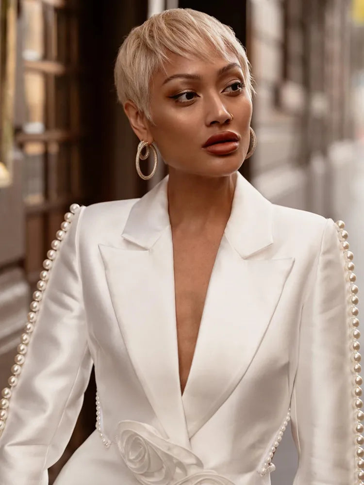 Step into elegance with the Elena Pearl V-Neck Set. This sophisticated ensemble combines a long-sleeve, V-neck top adorned with pearl details and high-waisted white pants, offering a touch of celebrity-inspired style for winter.