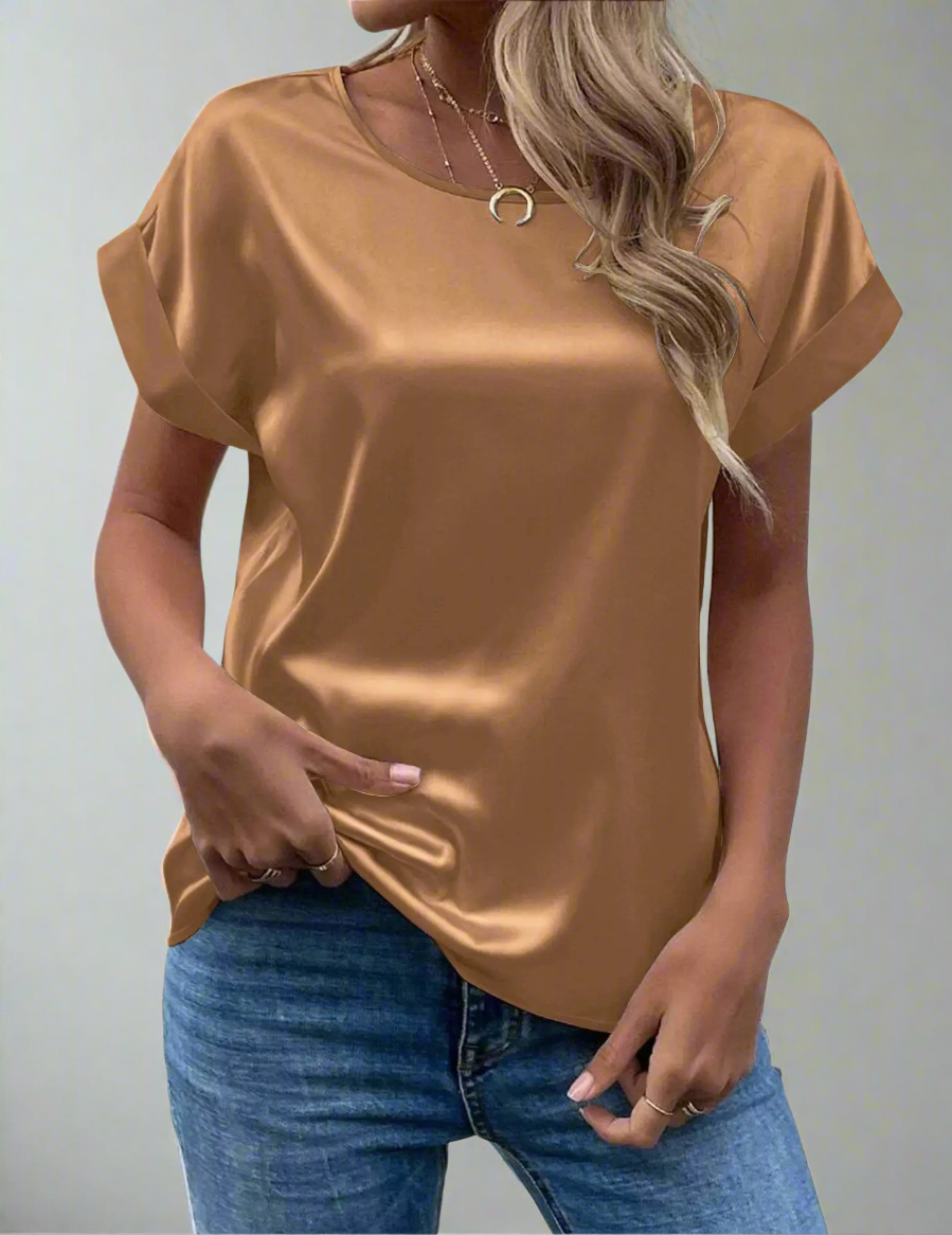 Discover effortless elegance with the Emma satin blouse, designed to make you feel graceful and comfortable. Crafted with soft, breathable satin fabric, this short-sleeve tee effortlessly combines style with ease, perfect for a relaxed yet fashionable look this summer.