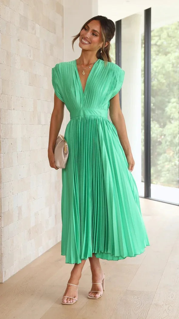 Step into timeless sophistication with the Aisha dress. This piece boasts a flattering plunge neckline and graceful pleats, blending modern design with classic charm. It’s the perfect choice for those seeking elegance with every step.