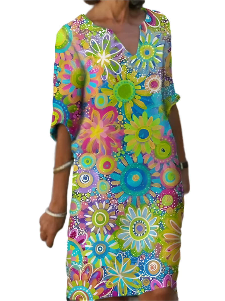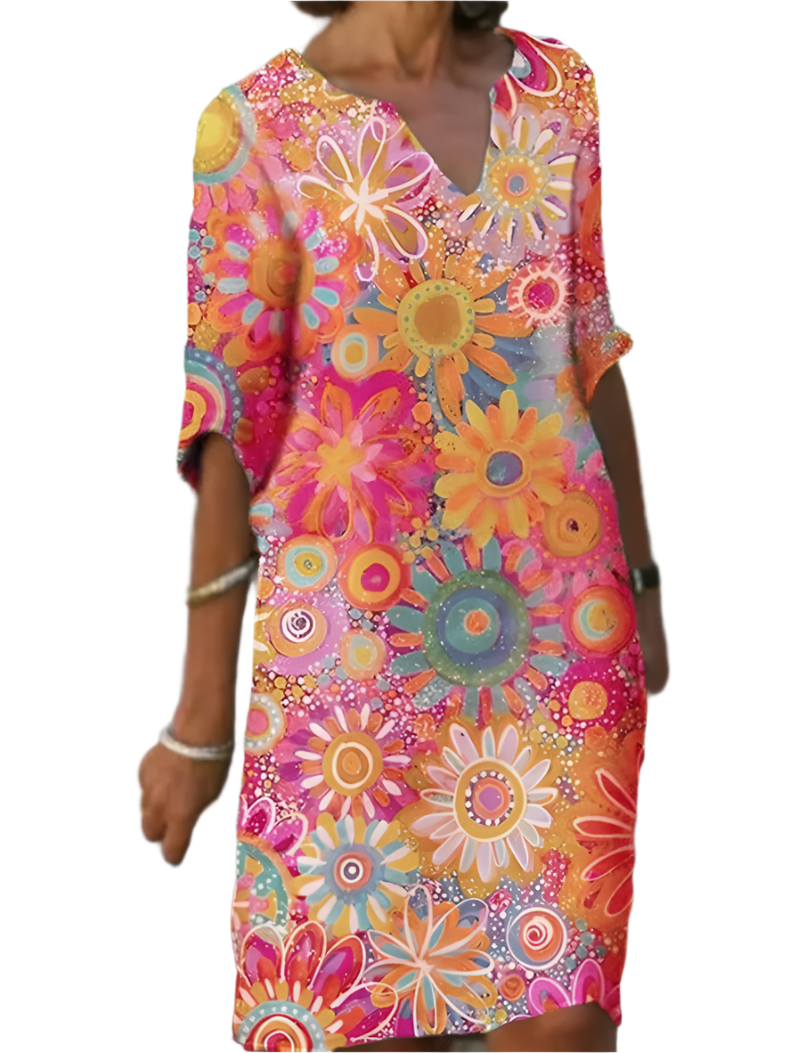 The Giulia dress features a fresh floral print and a flattering V-neckline, making it a versatile piece that transitions seamlessly from casual outings to more formal events. Its lightweight, comfortable fabric ensures you can wear it all day without compromising on style. Perfect for warm days, this dress is your go-to option for every occasion.