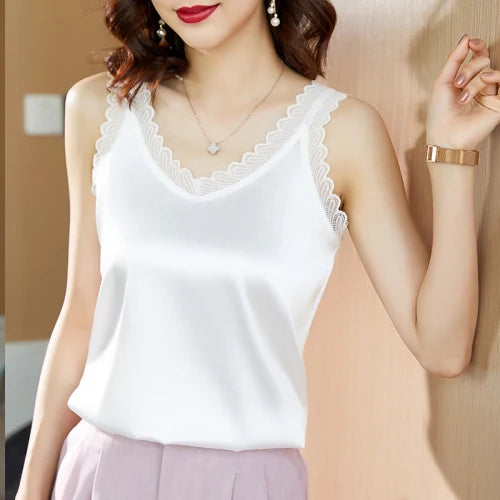 The Isabella Sleeveless Silk Lace Shirt is your go-to for a radiant, confident summer look. Whether paired with tailored pants for a polished outfit or jeans for casual grace, this top elevates your style with its perfect blend of comfort and class.